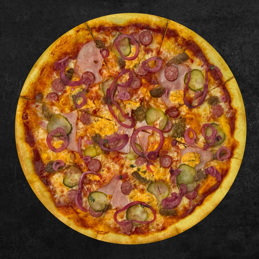 Томатная паста пелати, сыр моцарелла, ветчина, рваная свинина, охотничьи колбаски, фирменный соус, огурец маринованный, лук маринованный