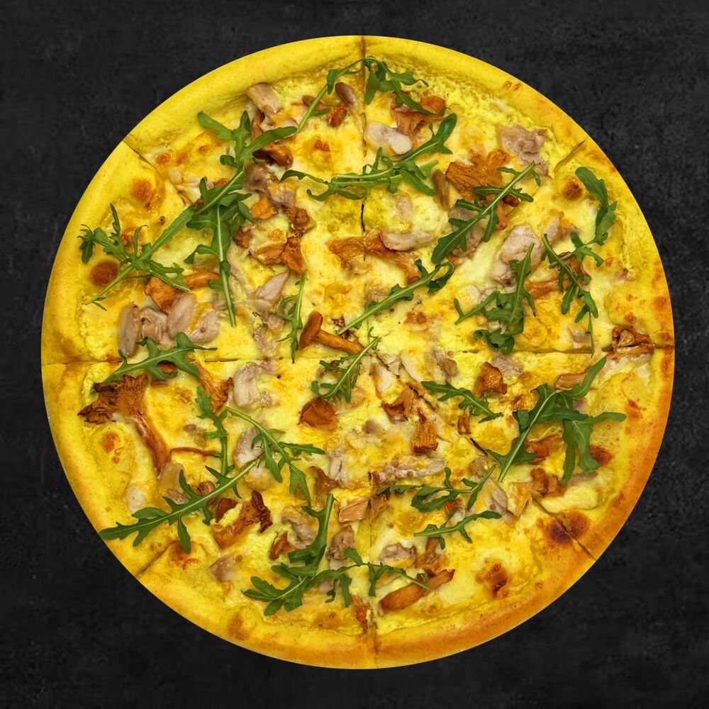 Сливочный соус, сыр моцарелла, курица, грибы лисички, сыр чеддер, руккола