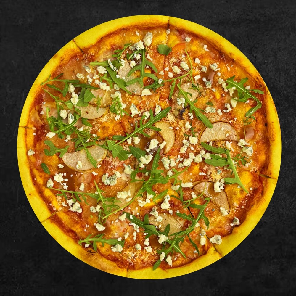Томатная паста пелати, сыр моцарелла, груша, сыр дор блю, соус манго-чили, руккола