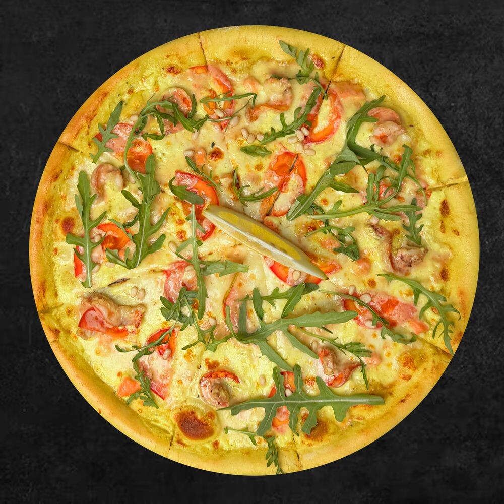 Сливочный соус, сыр моцарелла, креветки, лосось, томаты, кедровые орехи, ореховый соус, руккола, лимон