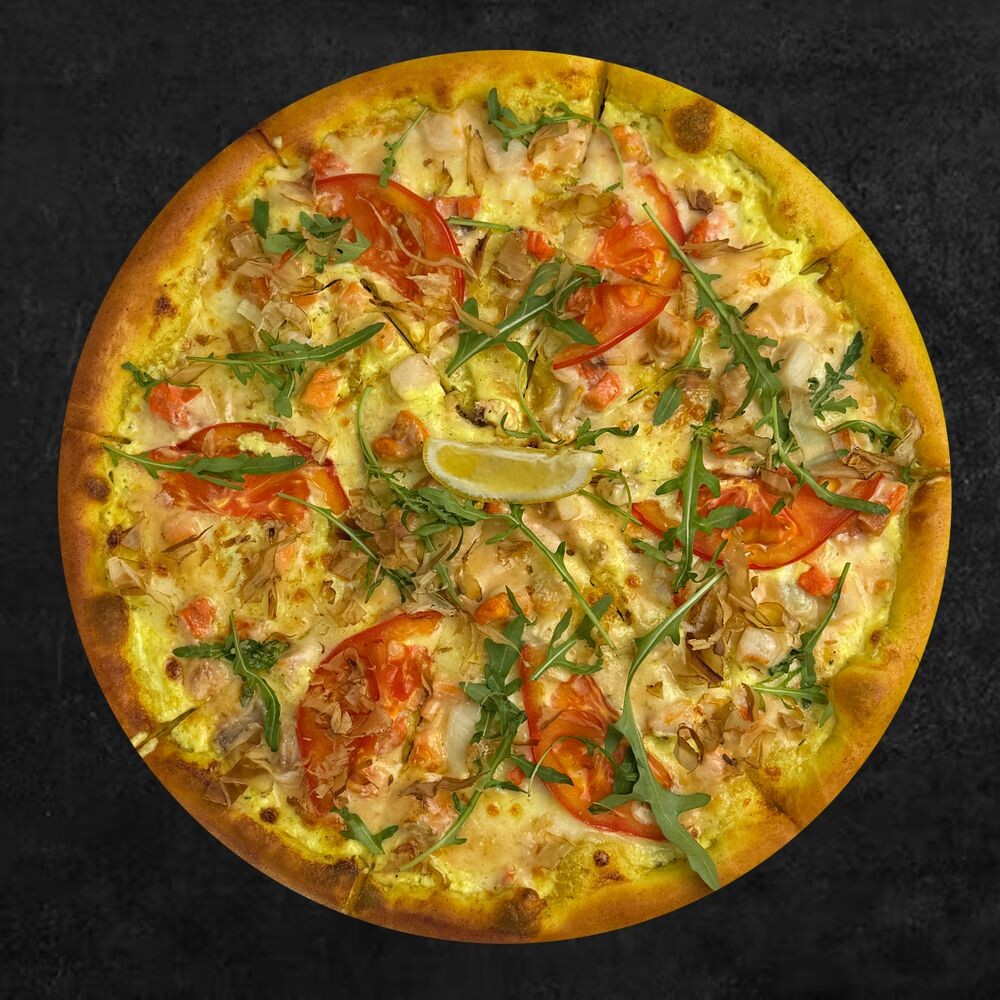 Сливочный соус, сыр моцарелла, лосось слабосолёный, телапия, стружка бонито, сыр, томаты, кунжутно-пикантный соус, лимон