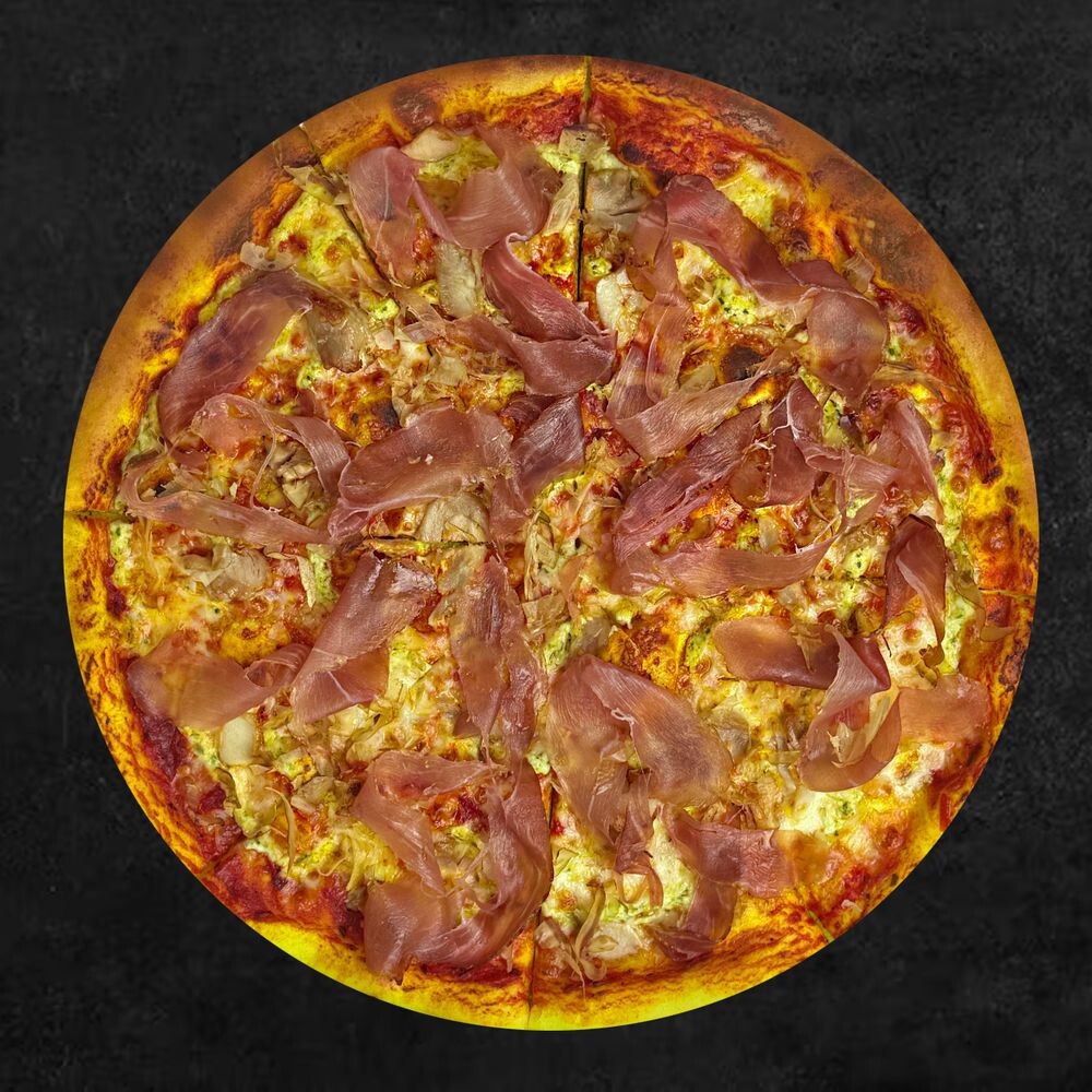 Томатная паста пелати, сыр моцарелла, курица, пармская ветчина, стружка бонито, соус «Цезарь»