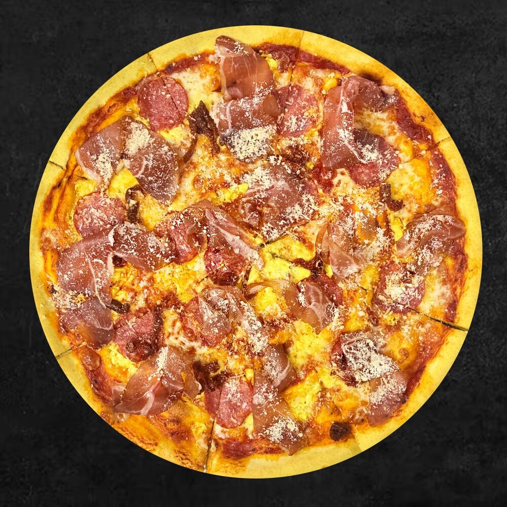 Томатная паста пелати, сливочный соус, сыр моцарелла, сыр пармезан, пармская ветчина, колбаса салями, вяленые томаты