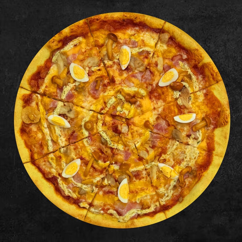 Томатная паста пелати, сыр моцарелла, бекон, курица, яйцо перепелиное, сыр «чеддер», соус «цезарь», опята маринованные